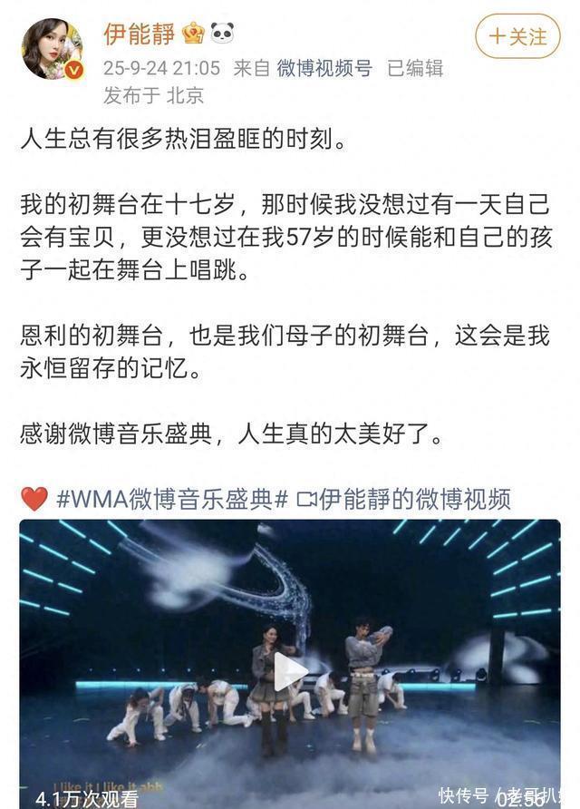 9月24日,“WMA微博音乐盛典”开始了,伊能静与儿子恩利也作为表演嘉宾登上了舞台,这也是母子俩的首次荧幕初舞台。 伊能静发文写道:“人生总有很多热泪盈眶的时刻……恩利的初舞台,也是我们母子的初舞台,这会是我永恒留存的记忆……人生真的太美好了。”
